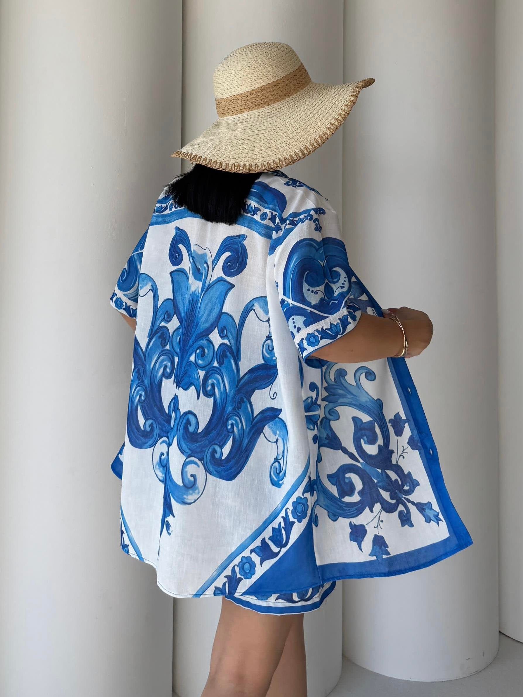 Evoking the charm of hand-painted Italian ceramics and sun-drenched terraces, the Capri Barocco Linen Short Set captures resort elegance with ease. Vivid cobalt flourishes sweep across crisp white linen, creating a bold yet balanced silhouette that feels both timeless and fresh.