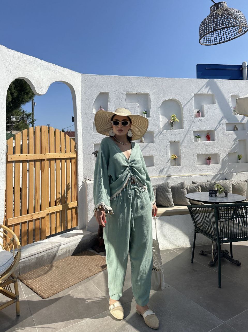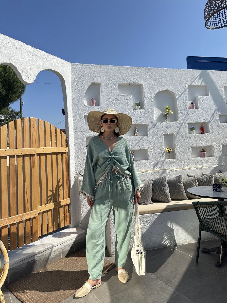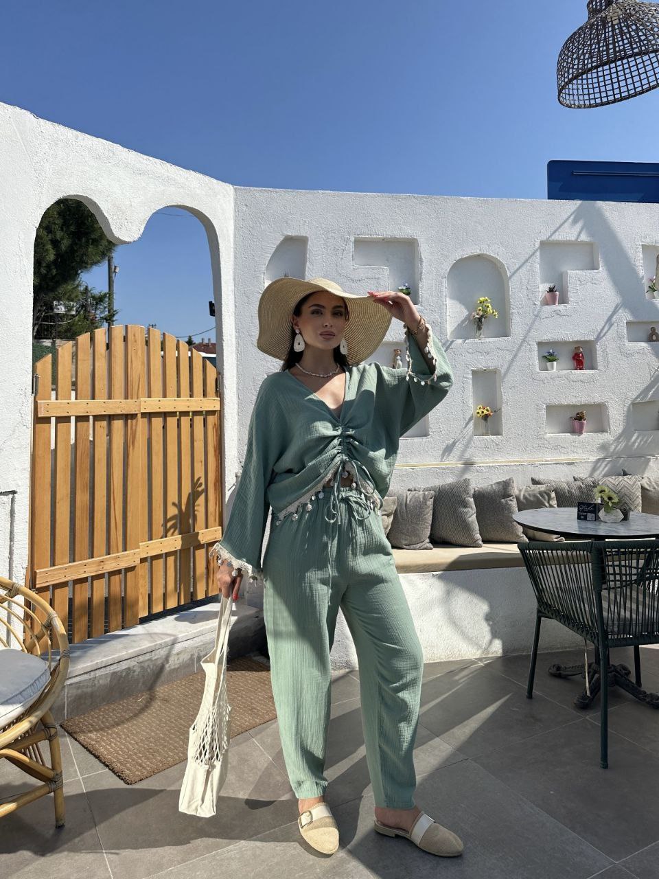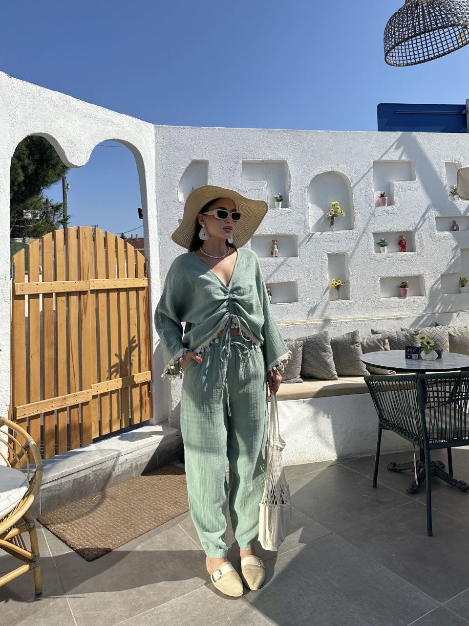 Paired with wide-leg muslin pants and a comfy elastic waist, this set is perfect for beach days, brunch dates, or sunset strolls.
