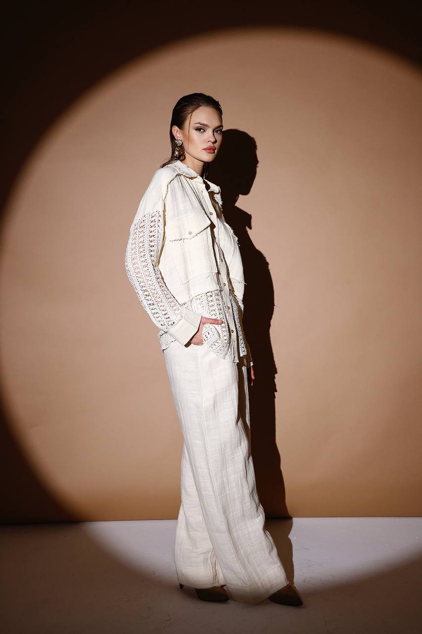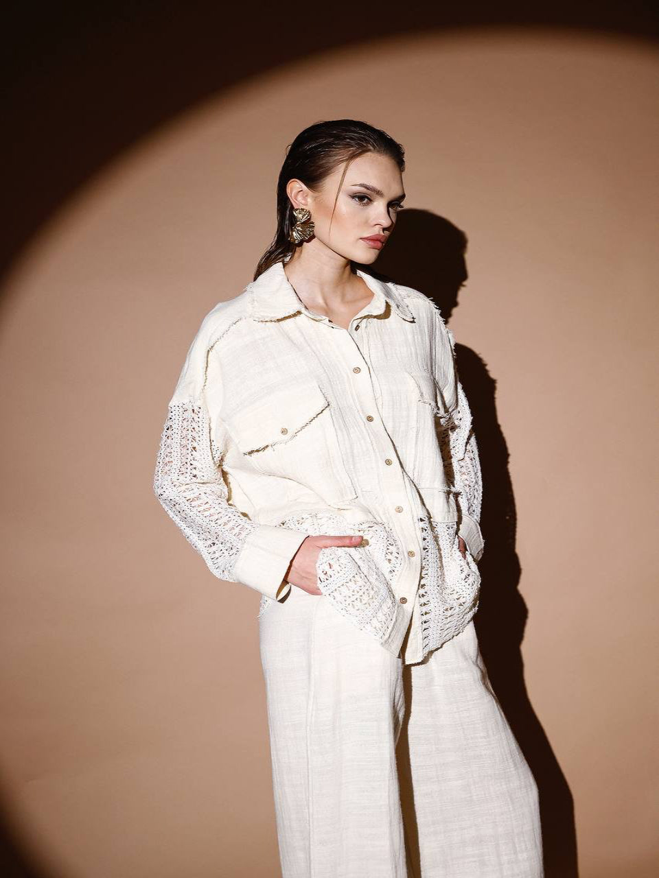 Effortlessly stylish, this oversized top is crafted from a soft muslin-linen blend for breathable comfort. Featuring exquisite crochet detailing, raw-edged finishes, and loose cotton tassels as part of the design, it brings a relaxed, boho-chic vibe to any outfit. Perfect for pairing with our wide-leg pants or wearing on its own for a statement look.