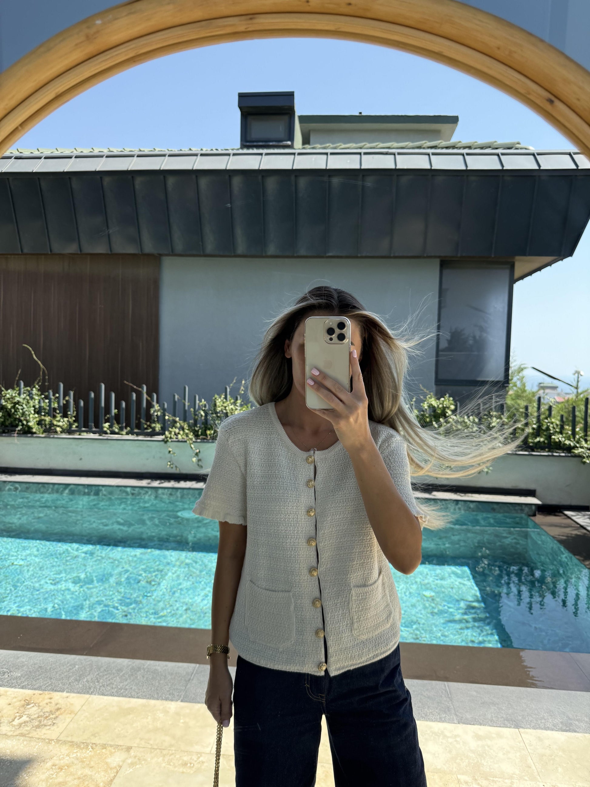 Short-Sleeve Cream Knit with Gold Buttons