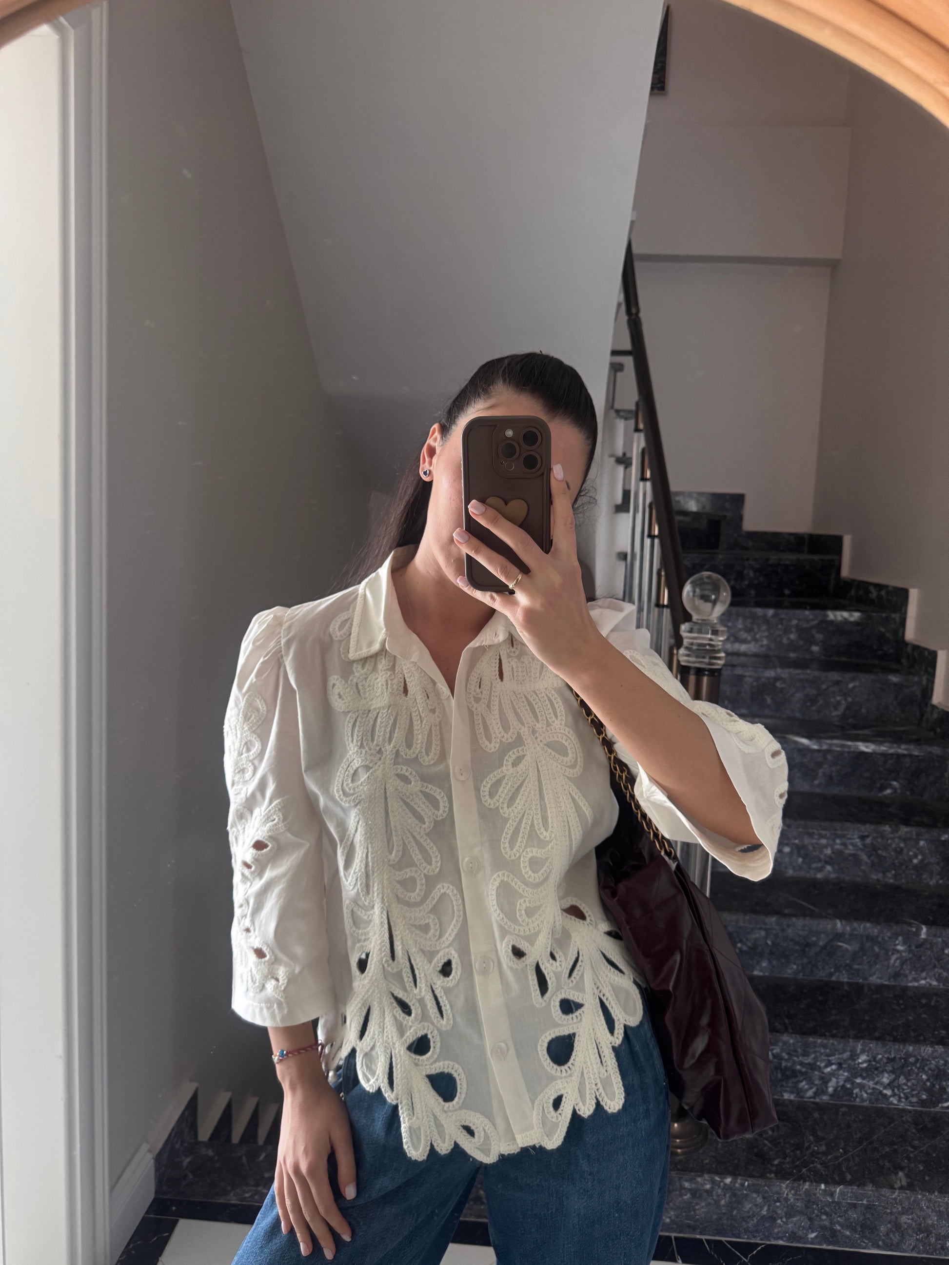 A timeless collared white shirt elevated with delicate tonal embroidery and subtle cutout patterns. Crisp, fresh, and effortlessly chic — perfect for pairing with tailored bottoms or denim for a modern classic look.