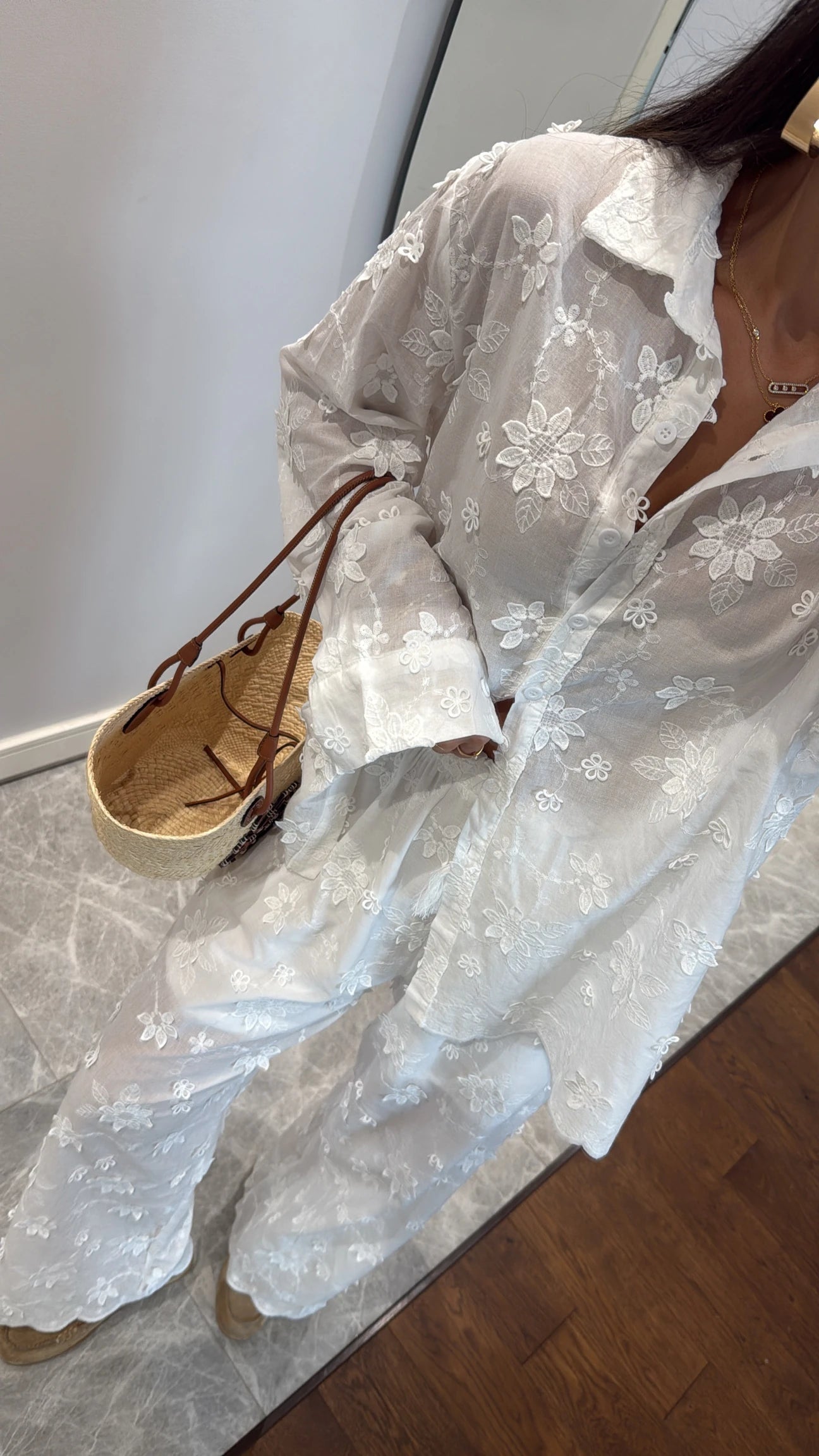 Chic, playful, and effortlessly stylish – this two-piece set brings a touch of romance to your everyday wardrobe. The crisp white shirt is adorned with delicate floral appliqué, adding texture and charm, while the matching trousers create a coordinated, put-together look with ease.